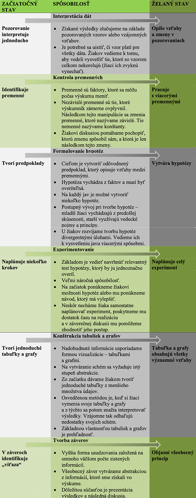 V Tabuľke 2.5 a 2.6 sú rozpracované jednotlivé spôsobilosti tak, že zachytávajú začiatočný stav, kedy žiak neprešiel žiadnym cieleným výcvikom, vykonáva ich prakticky na základe skúsenosti a pravá strana tabuliek zachytáva želaný, rozvinutý stav spôsobilostí. Vychádzajúc z publikácie Výskumne ladená koncepcia prírodovedného vzdelávania (Held et al., 2011), rozpracovala Lapitková a kol. (2015. s. 21-24) spôsobilosti vedeckej práce v zmysle opísanom vyššie, nasledovne: