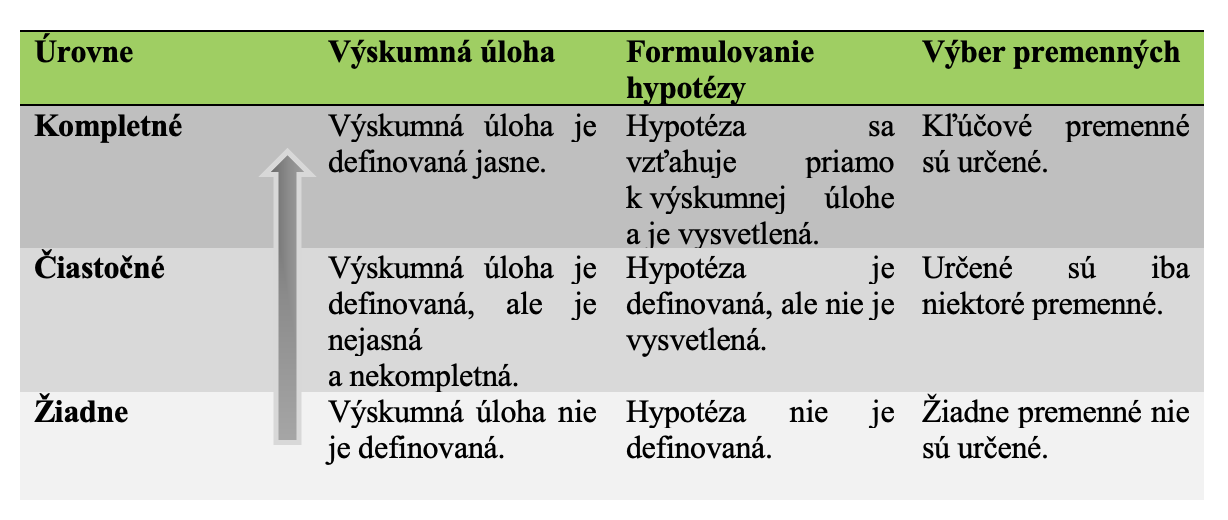 Úroveň osvojenia si spôsobilosti môžeme vyjadriť aj pomocou škály. Ukážka použitia takýchto kritérií je v Tabuľke 2.7 pre spôsobilosti týkajúce sa plánovacej fáze experimentu. Tabuľka je prevzatá z hodnotiaceho systému IB (International Baccalaureate) maturity.